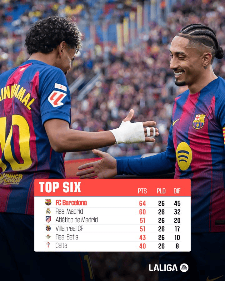 在最新的西甲积分榜上,巴萨在26轮比赛过后,以21胜1平4负的战绩,拿到了64分,排名积分榜榜首。皇马26轮战罢,以19胜3平4负的战绩,拿到了60分,排名第二名。马竞26轮过后以15胜6平5负的战绩,拿到51分,排名第三名。